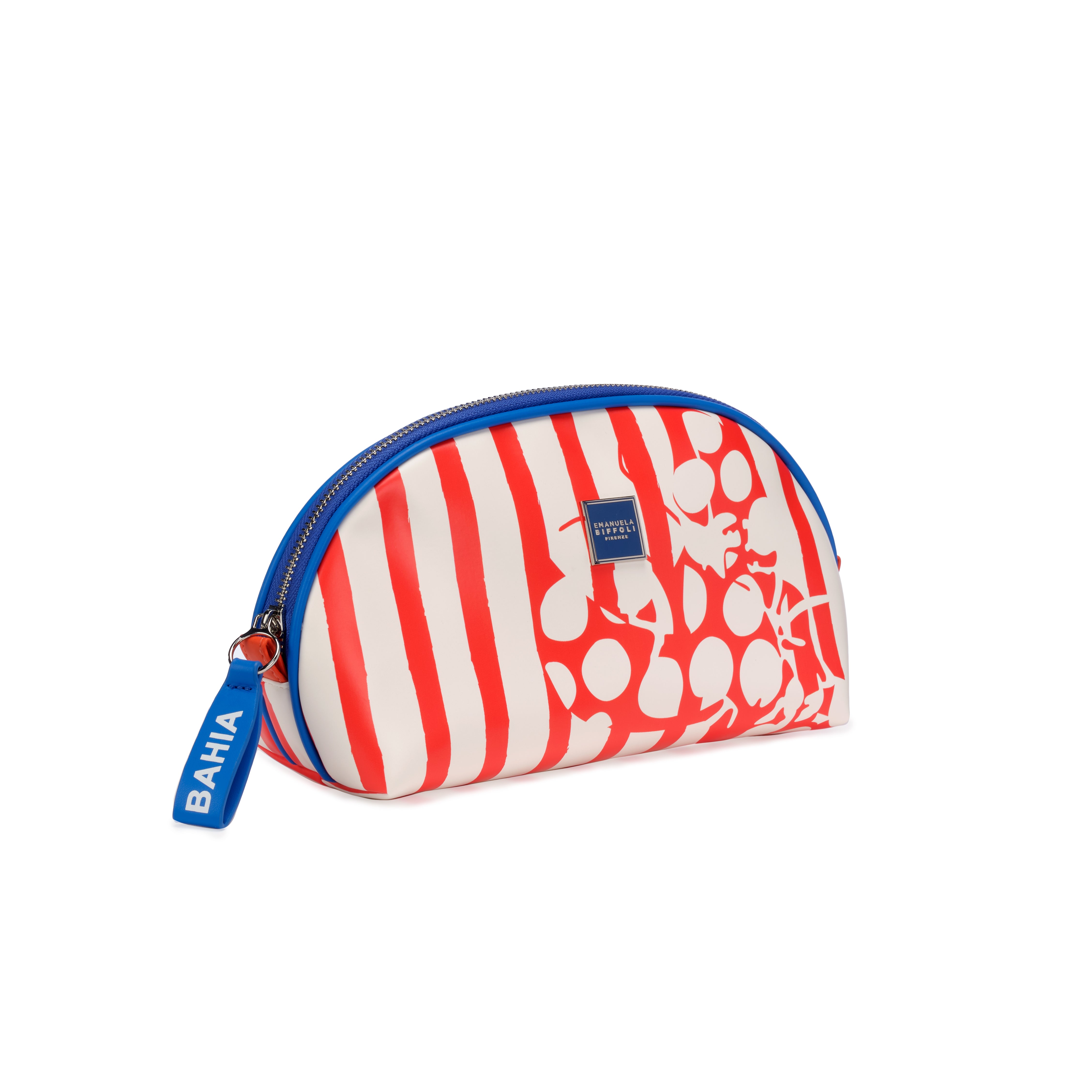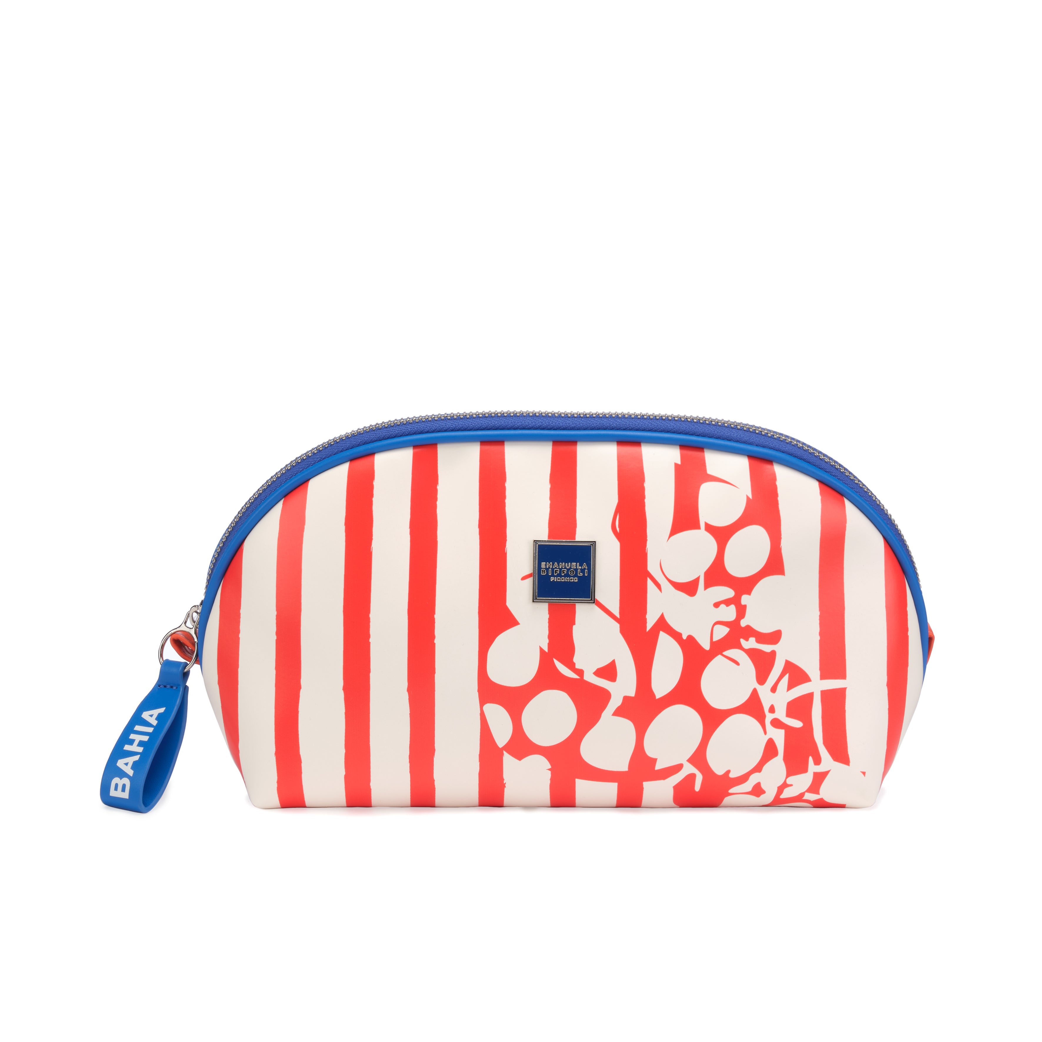 Pochette dal formato ampio e dal design vivace, caratterizzata da righe rosse e dalla grafica “Polka Lobster” che dona un tocco originale e distintivo. I dettagli blu a contrasto definiscono il profilo, creando un equilibrio perfetto tra stile grafico e freschezza estiva.