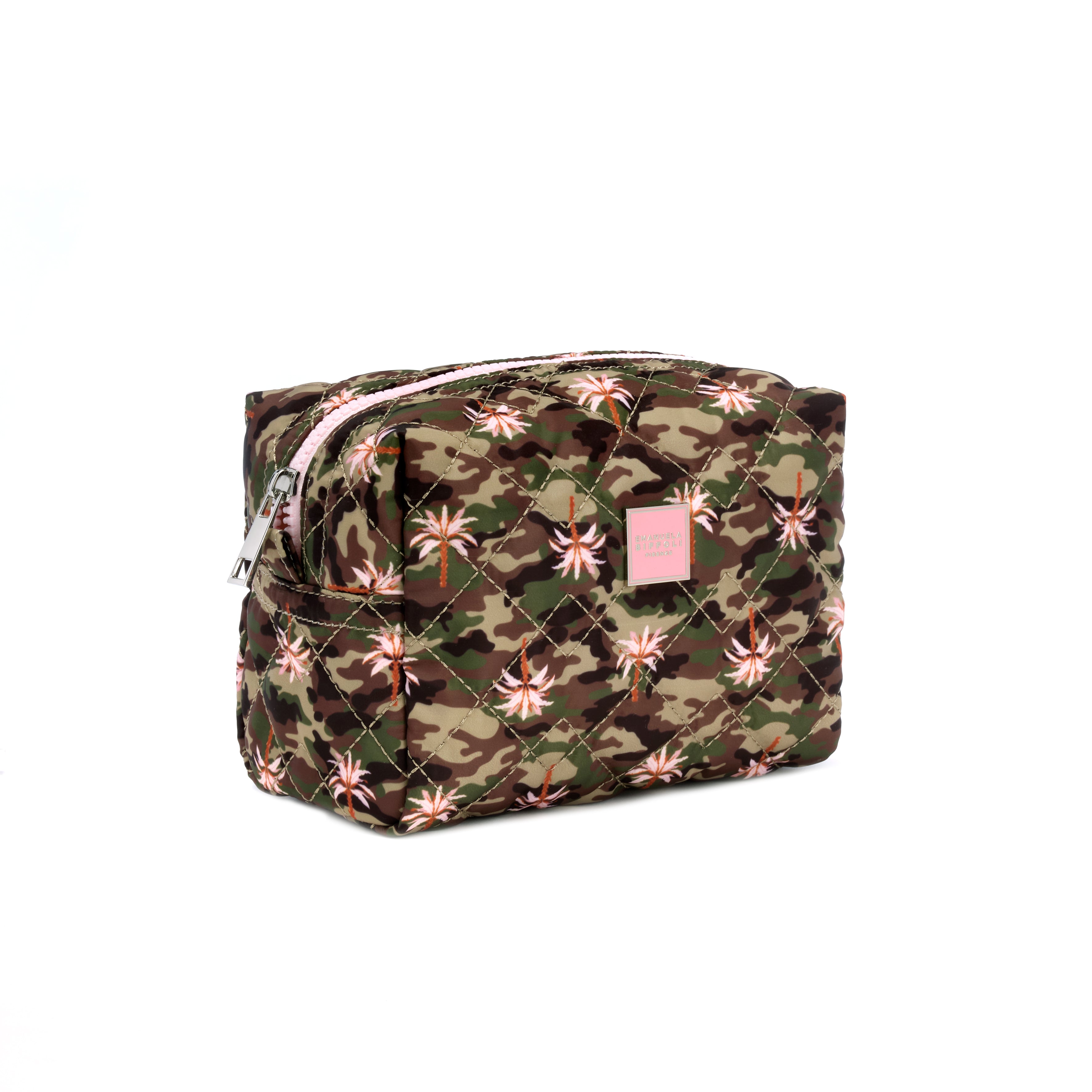 La stampa Palmouflage reinterpreta il motivo mimetico in chiave esotica e contemporanea, dando vita a una pochette beauty dal carattere distintivo e versatile. Realizzata in nylon trapuntato, è leggera, morbida e resistente, perfetta per custodire make up, prodotti skincare e accessori con praticità.