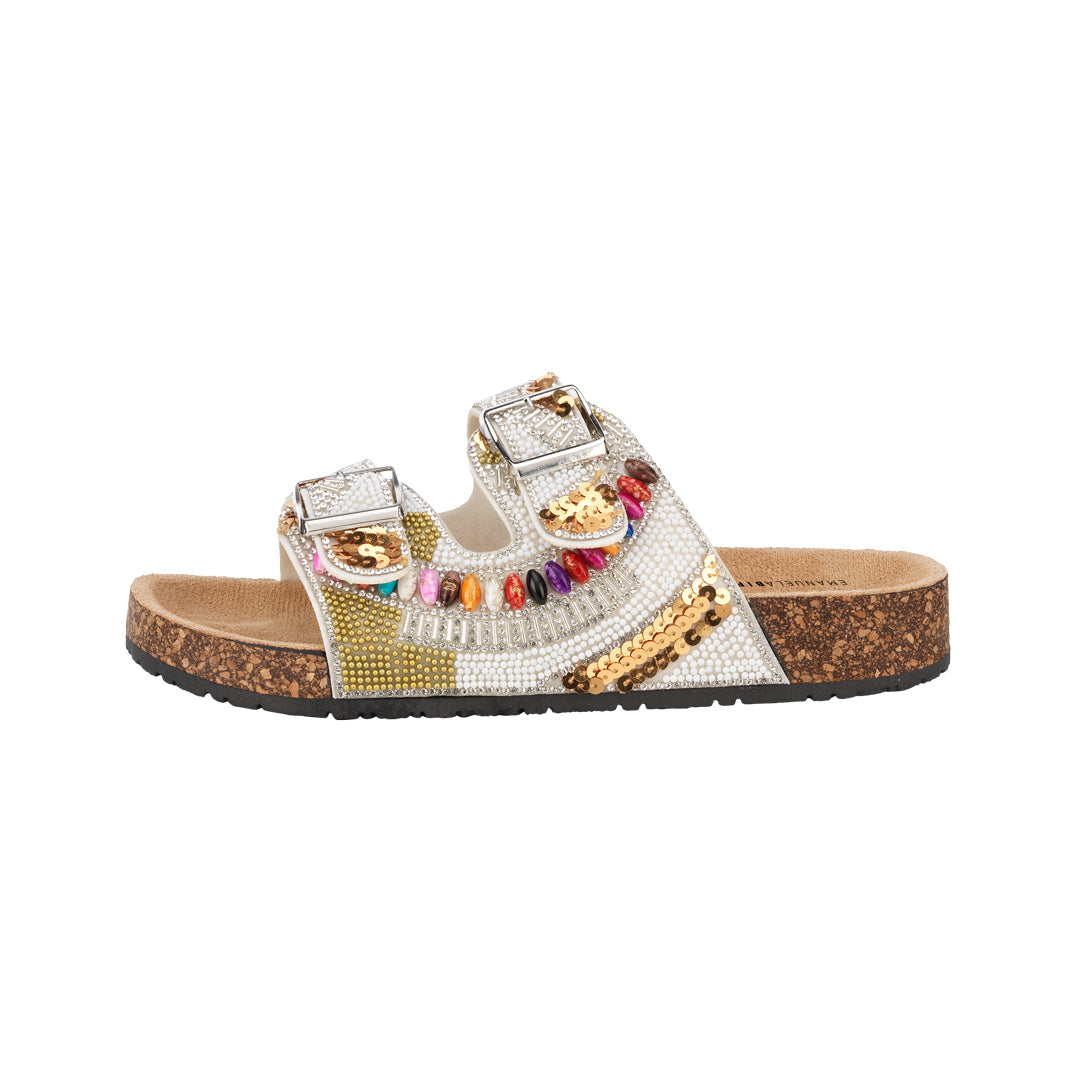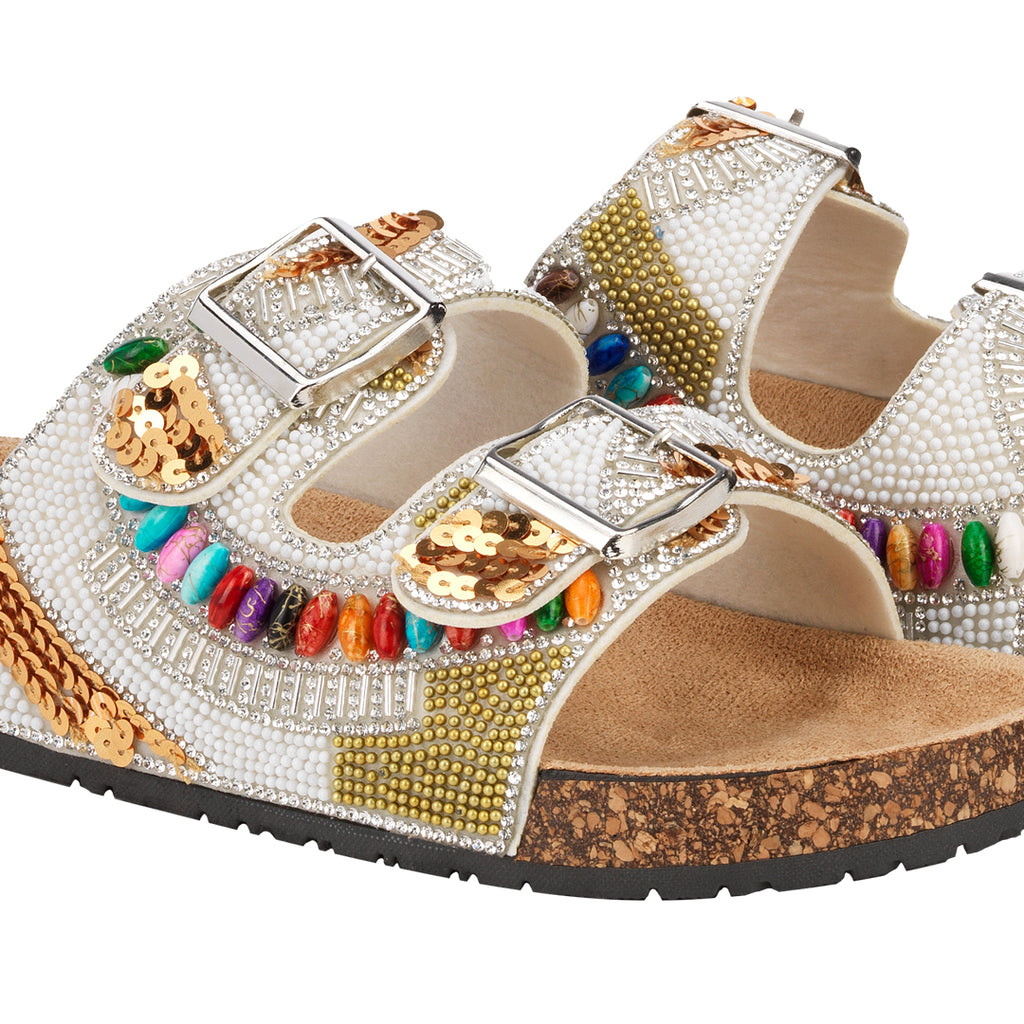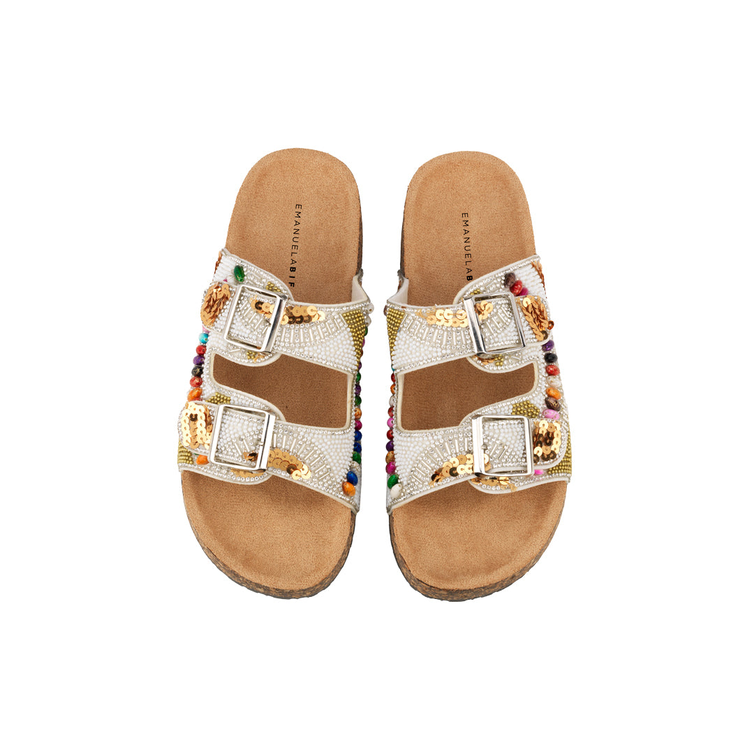 Realizzati con fasce decorate da strass bianchi, paillettes dorate, pietre multicolore e perline bianche e oro, applicati a mano con cura artigianale. La soletta color cuoio effetto scamosciato garantisce una calzata morbida, mentre la suola in PVC offre leggerezza e praticità.