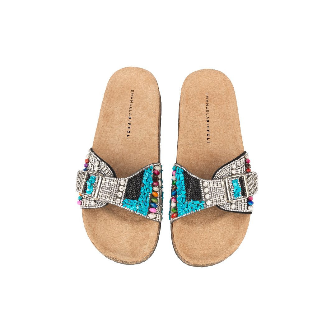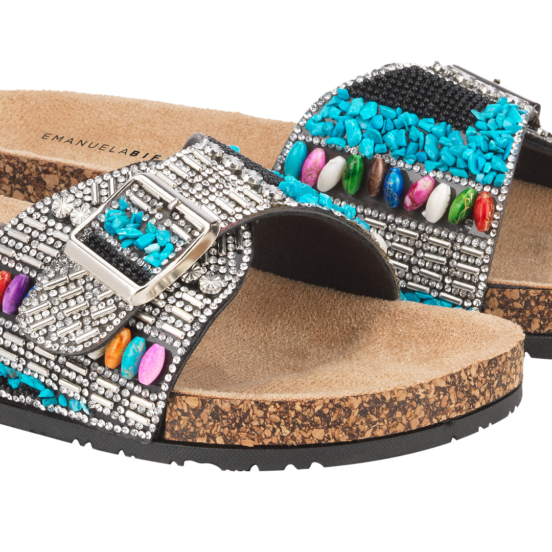 Lasciati conquistare dal fascino sofisticato di questi sandali a fascia, impreziositi da strass bianchi, pietre effetto corallo turchesi, pietre ovali multicolore e perline nere. Un mix di dettagli luminosi applicati a mano che donano un tocco esclusivo e artigianale.