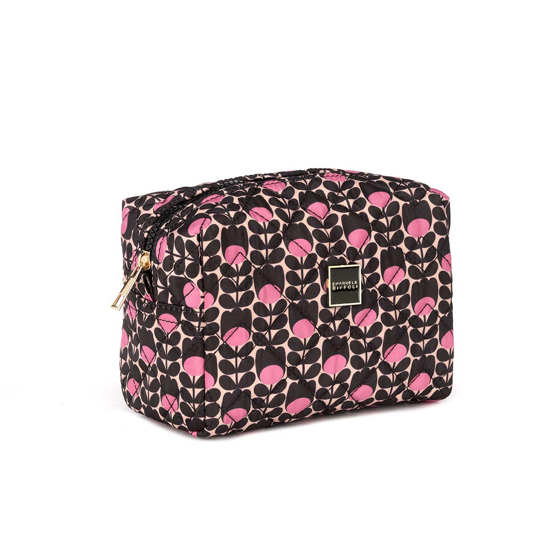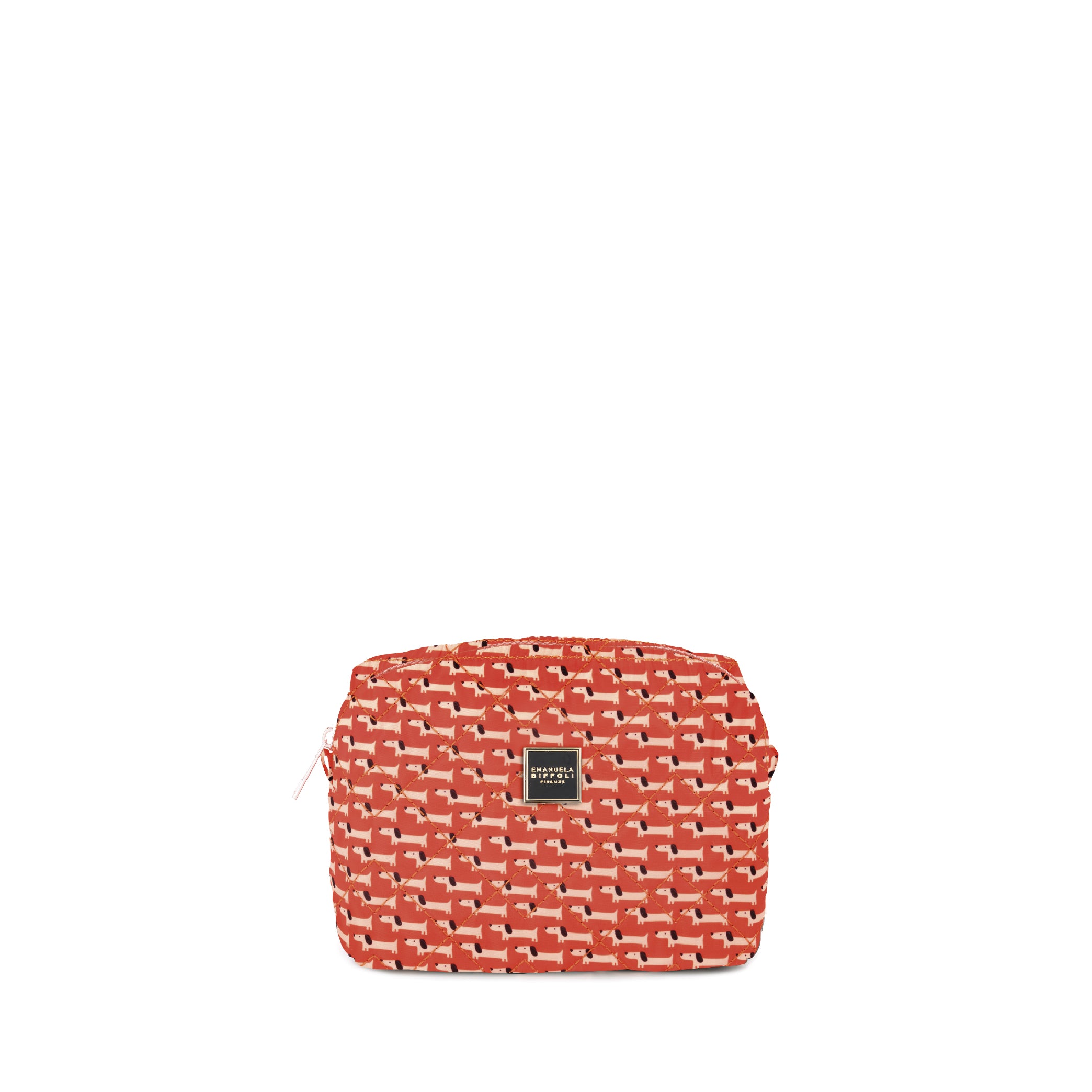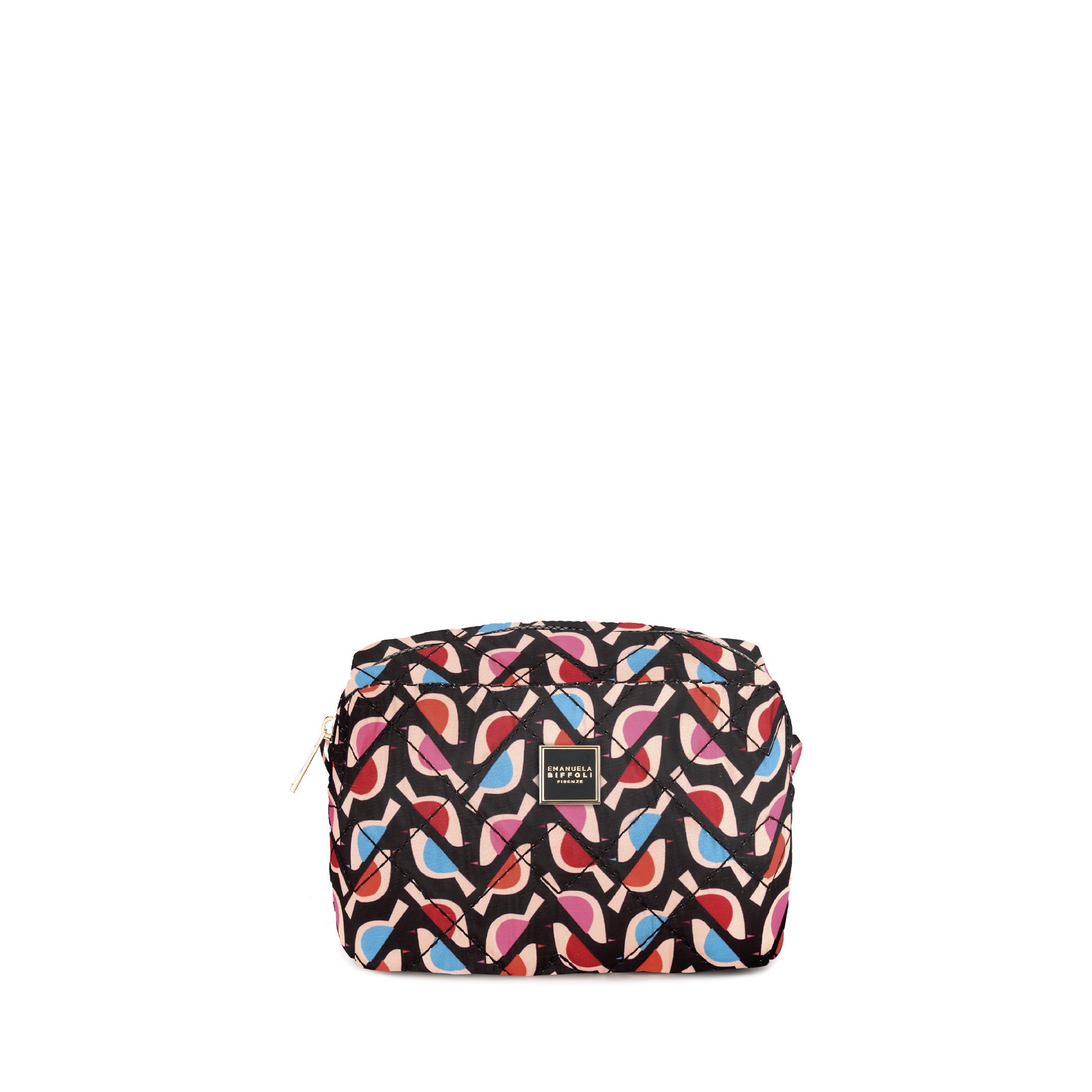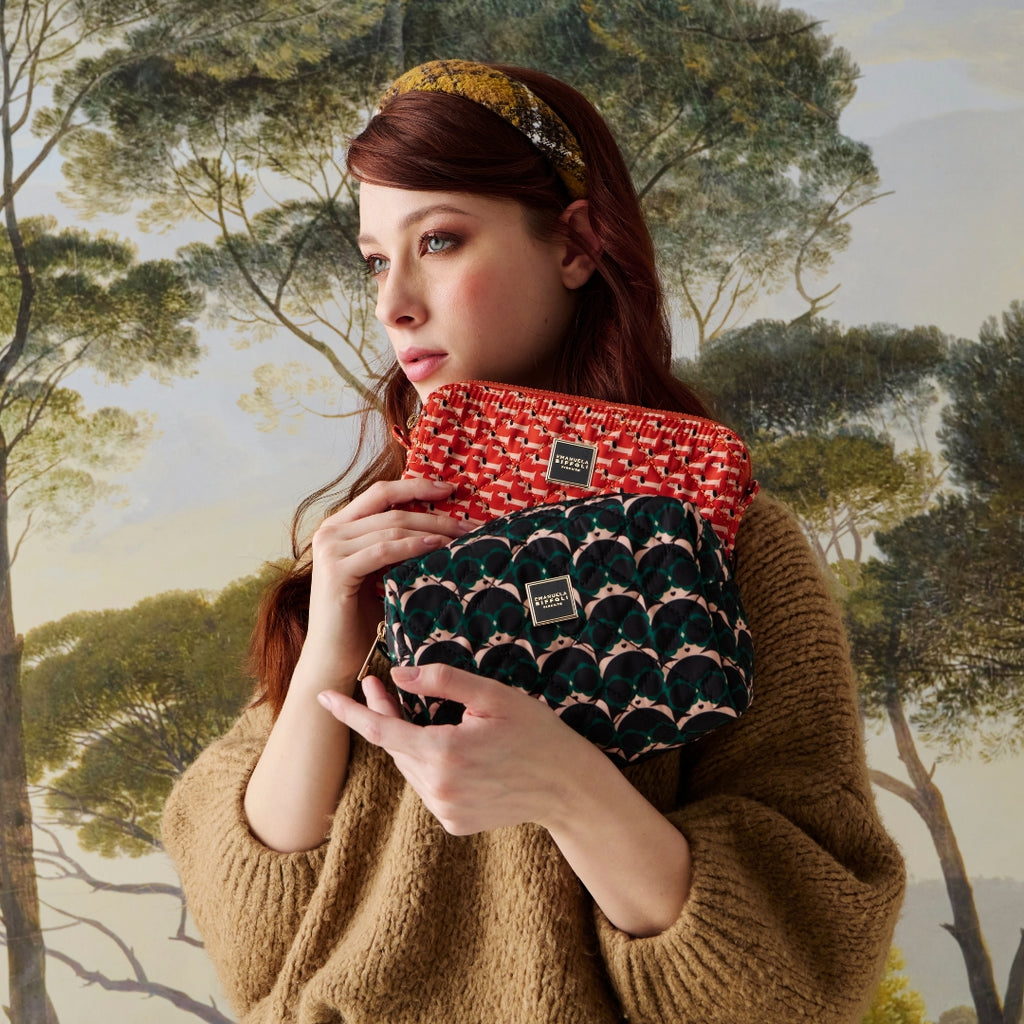 All’interno, la fodera personalizzata accoglie una pratica tasca piatta che consente di organizzare al meglio gli oggetti indispensabili. Compatta e versatile, questa pochette è ideale da portare in borsa o da utilizzare da sola come accessorio colorato e moderno, perfetto per ogni occasione.