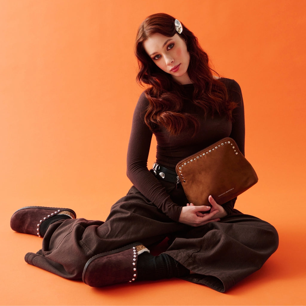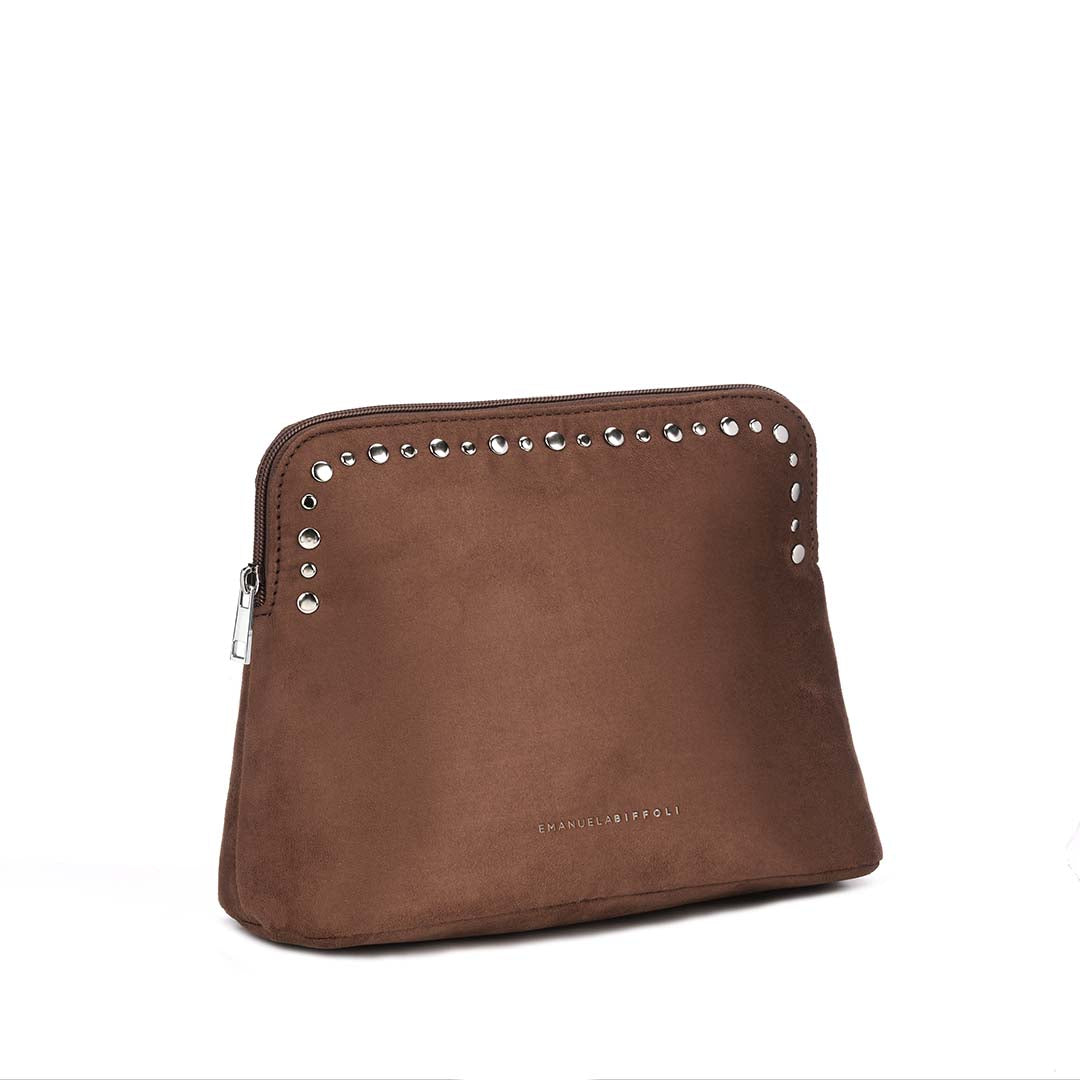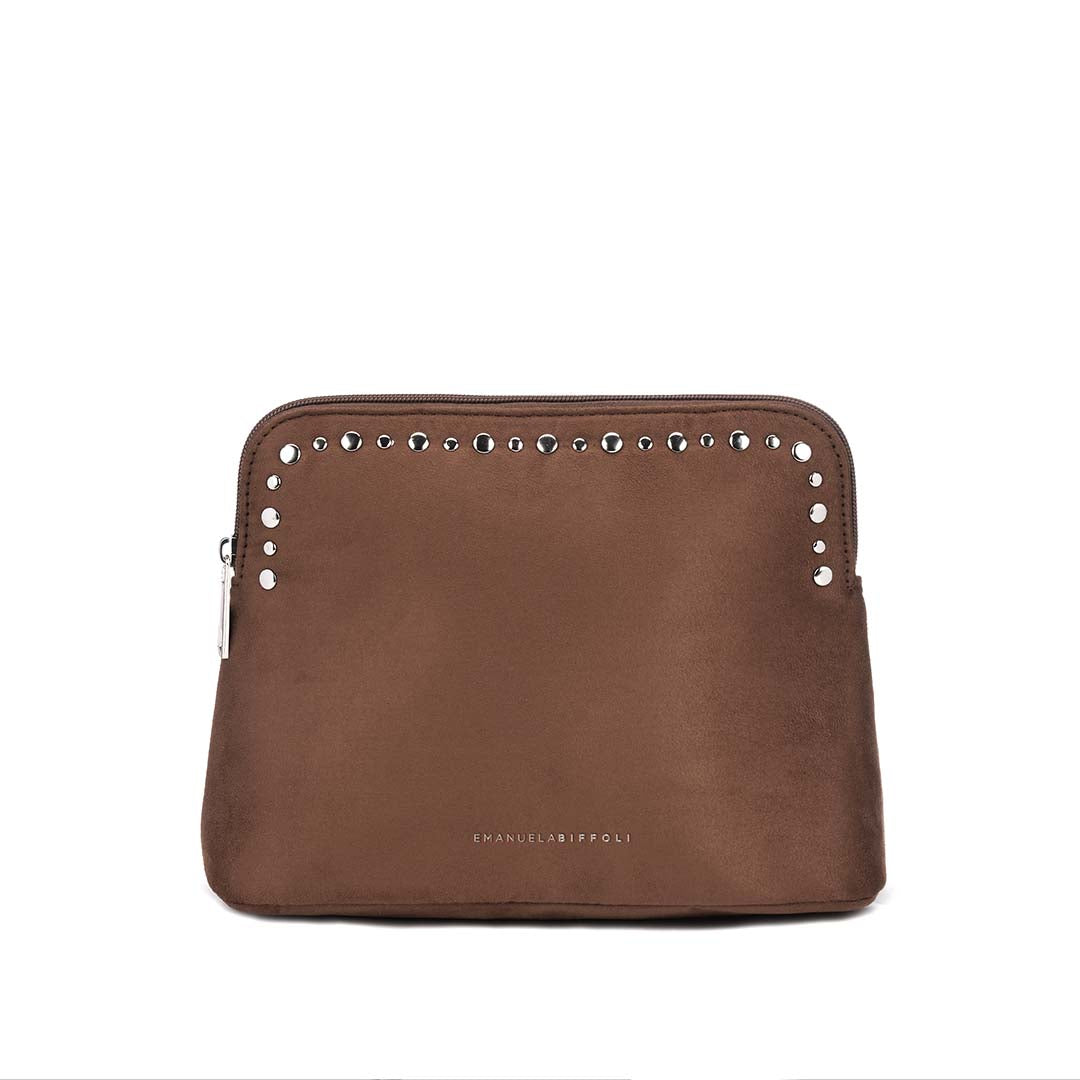 La Busta Grande marrone con borchie è un accessorio dal carattere deciso e sofisticato, pensato per chi ama unire praticità e stile contemporaneo. Realizzata in eco-pelle scamosciata dalla texture morbida e vellutata, è impreziosita da una fila di borchie argento che illuminano il design essenziale, rendendolo unico e grintoso. La chiusura con cerniera in nylon e tiralampo argentato garantisce sicurezza e funzionalità, mentre il logo argentato inciso aggiunge un dettaglio raffinato.