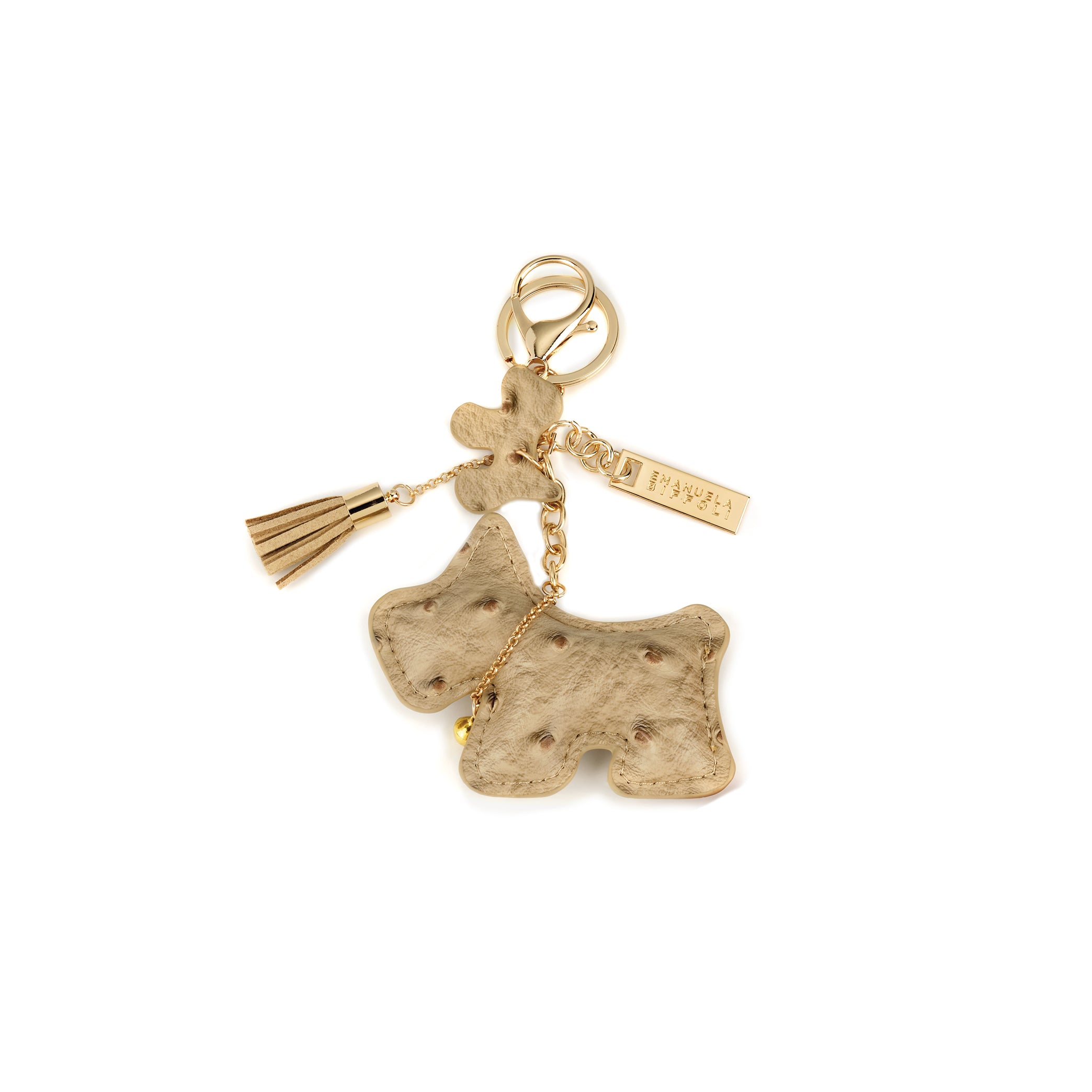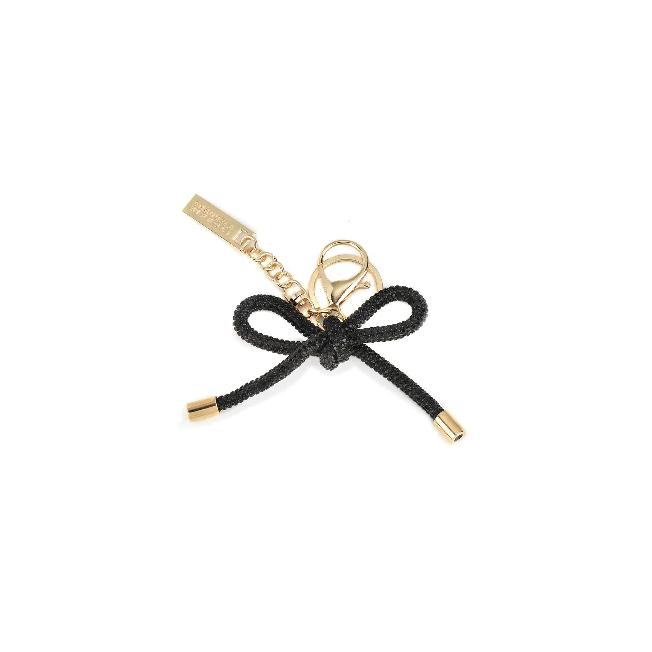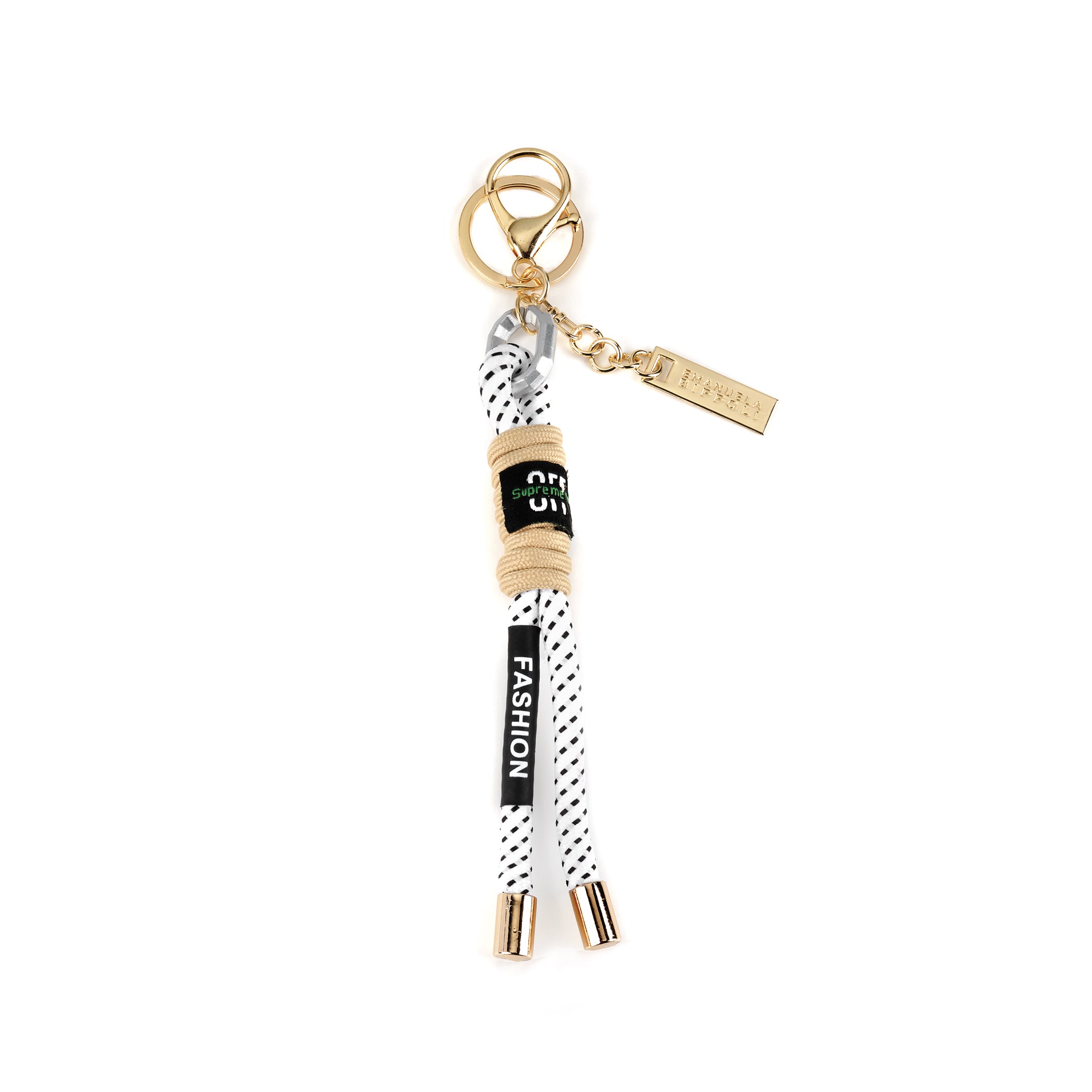 Chiusura: moschettone e anello in metallo dorato. Logo: targhetta in metallo oro.