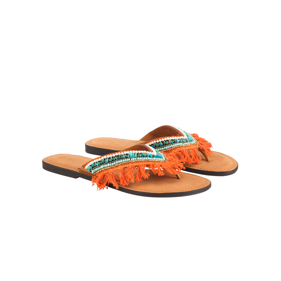 Un tocco boho-chic per l’estate: Lasciati conquistare dai Sandali Infradito impreziositi da perline bianche e acquamarina, arricchiti da vivaci nappe arancioni per un look fresco e originale.