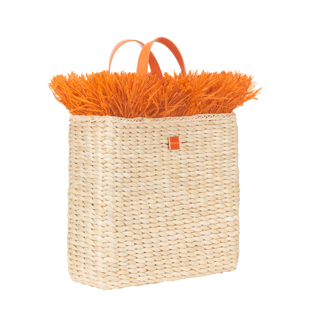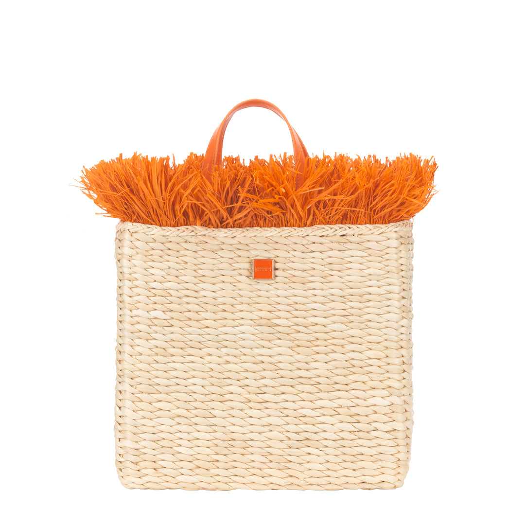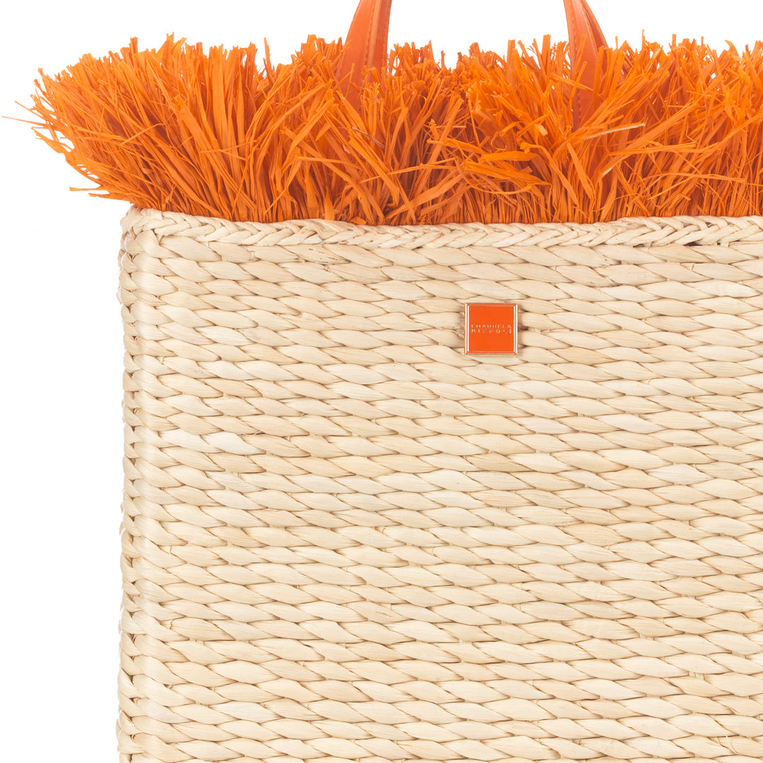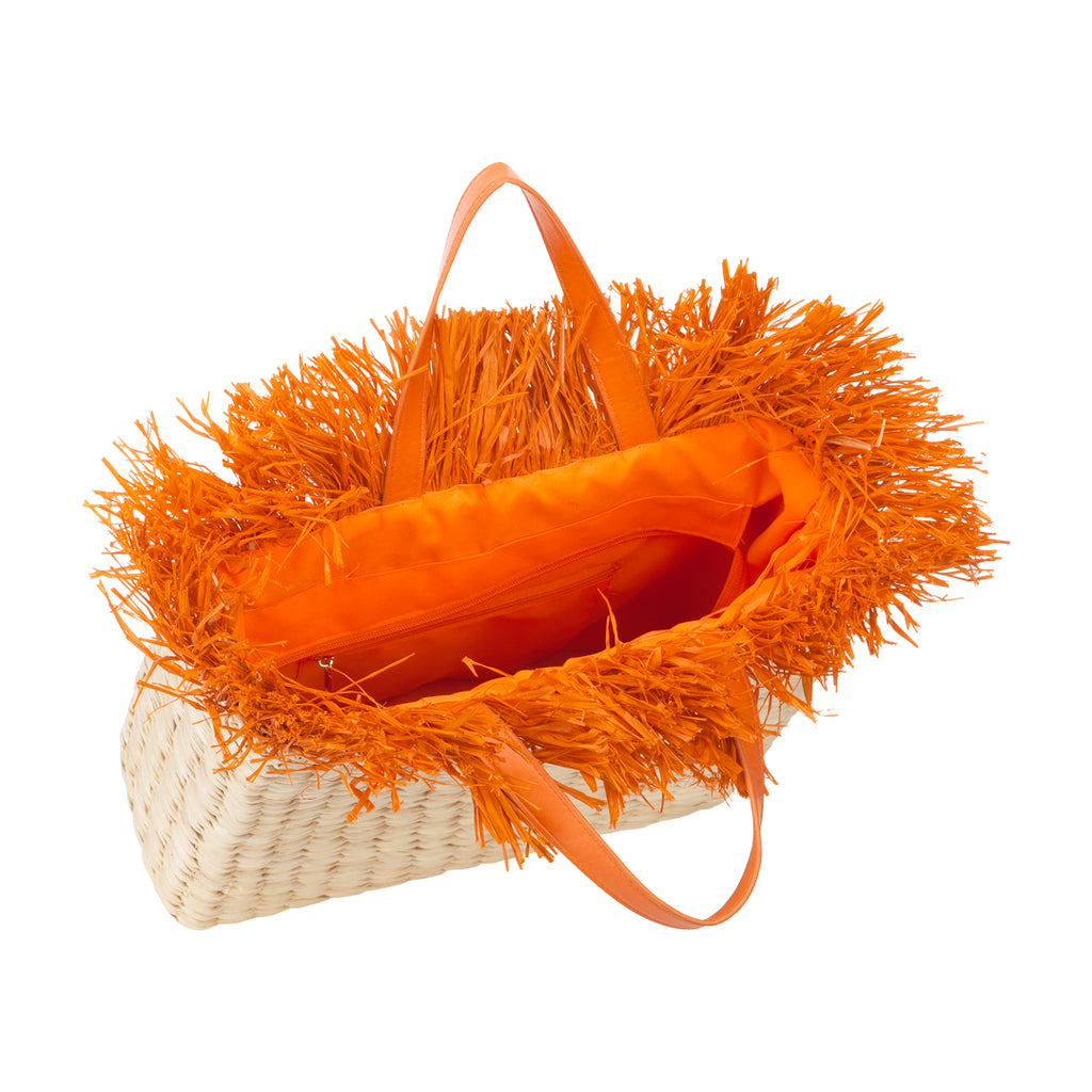 Scopri lo stile vivace e solare della shopper in paglia naturale con frange arancioni. Questo modello unico unisce eleganza e praticità, donando un tocco di colore energico ai tuoi look quotidiani.